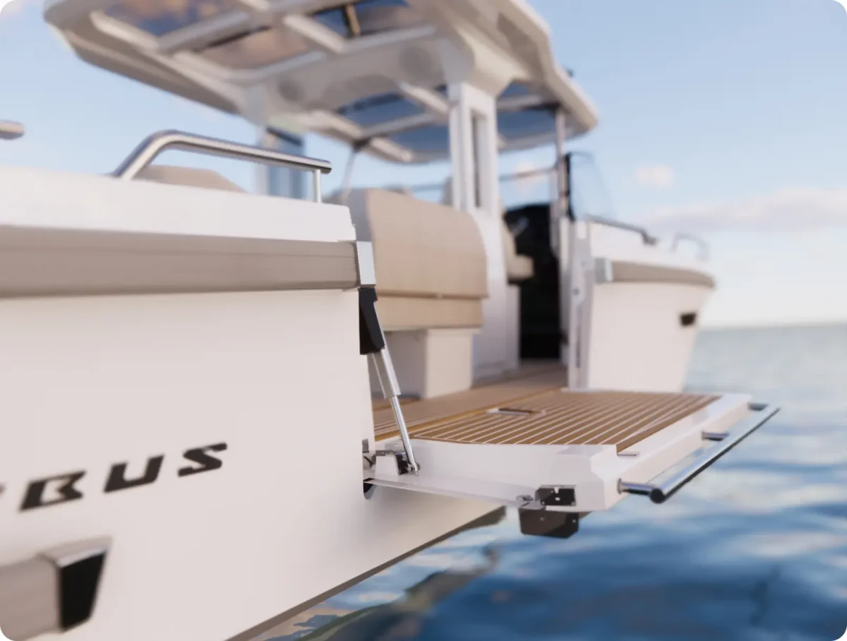 New extended swim platform with double mould for premium integration and rubrail following through on the hull