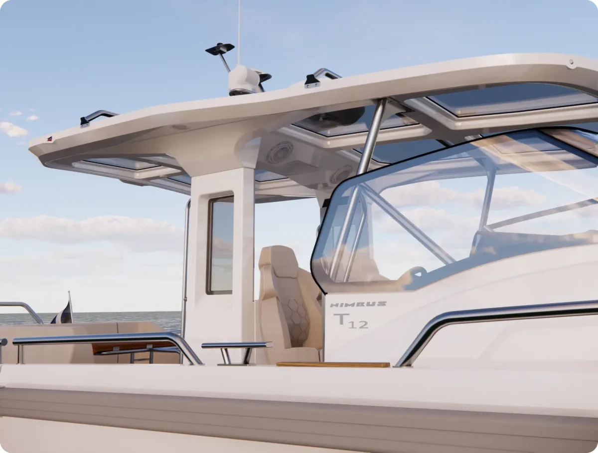 The W12 features the new Targa version with canopy in the style of the iconic Nimbus 32 Ballista, bringing heritage design into modern functionality. The starboard side balcony creates openness and flow for relaxation and entertaining.