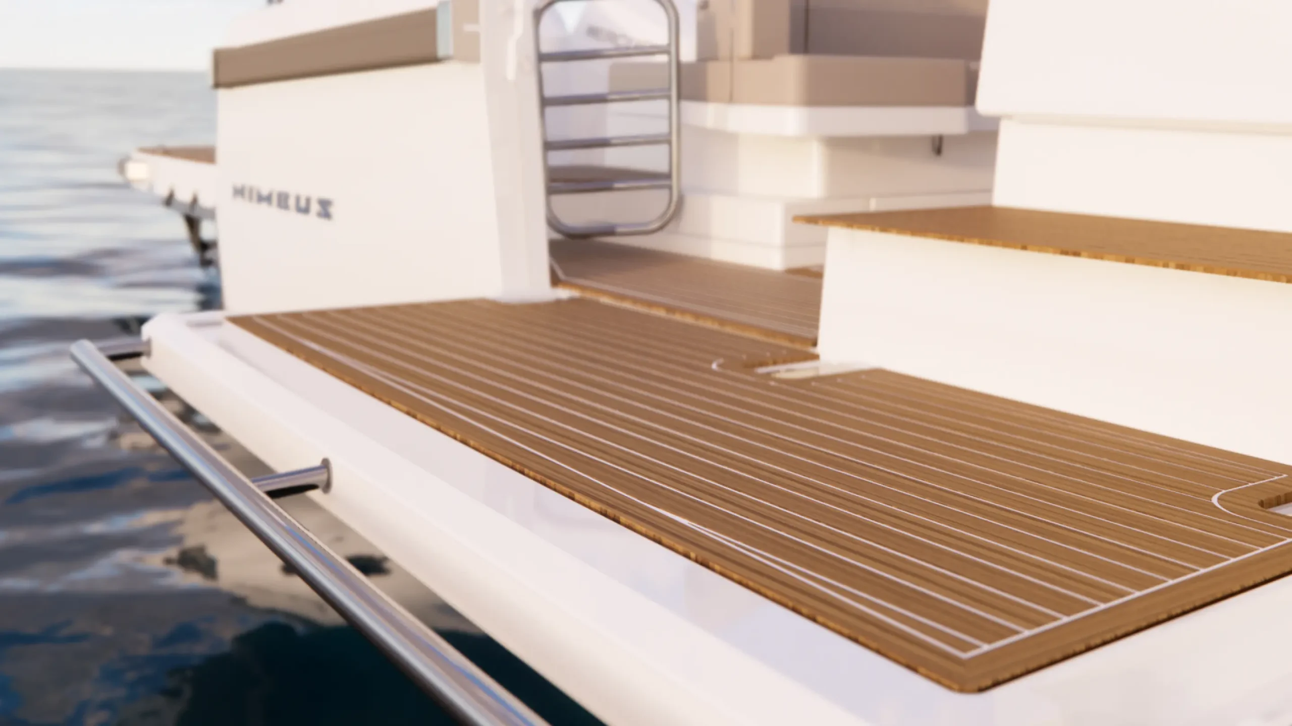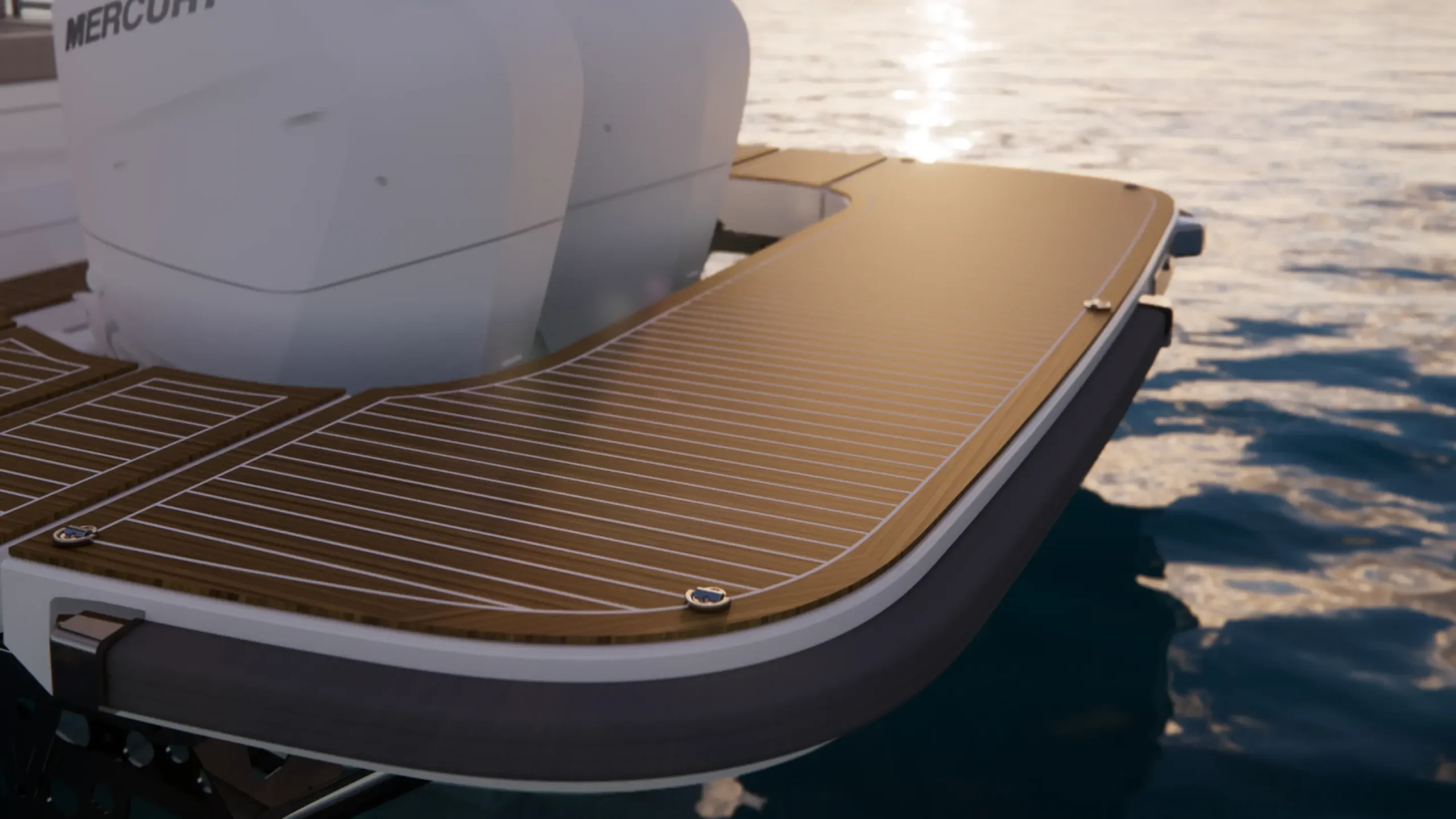New extended swim platform with double mould for premium integration and rubrail following through on the hull