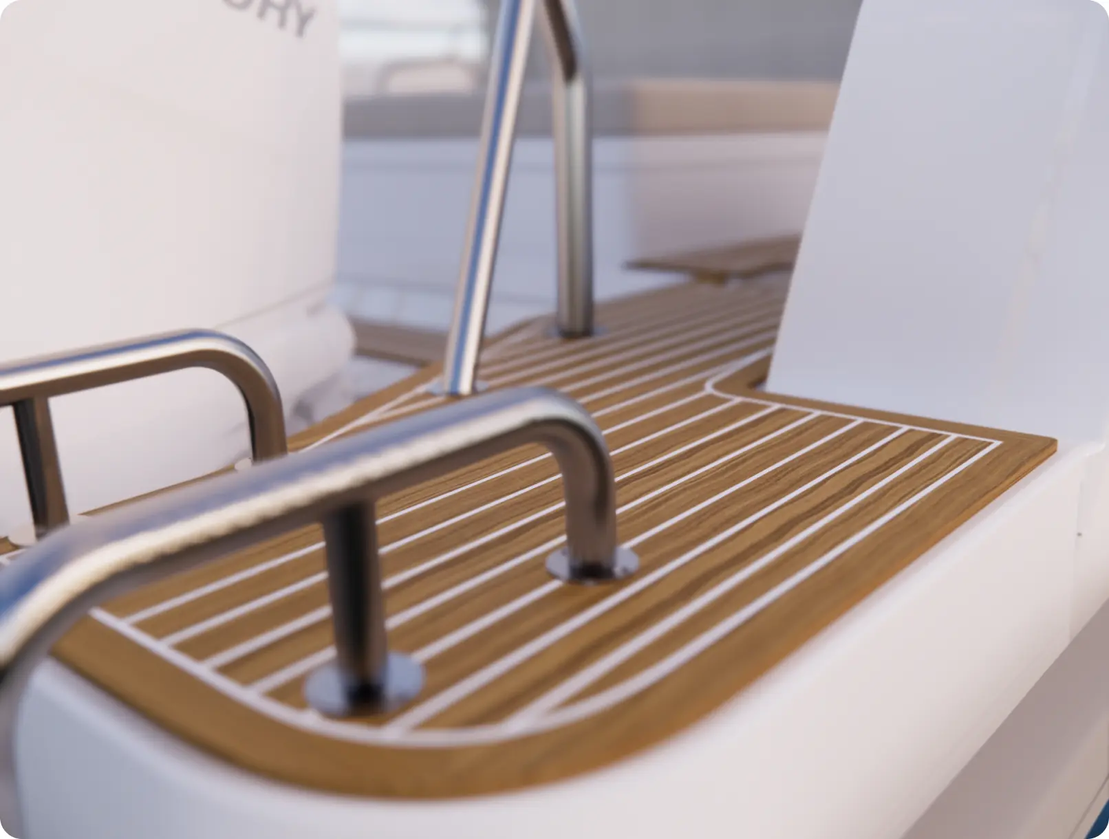 New extended swim platform with double mould for premium integration and rubrail following through on the hull
