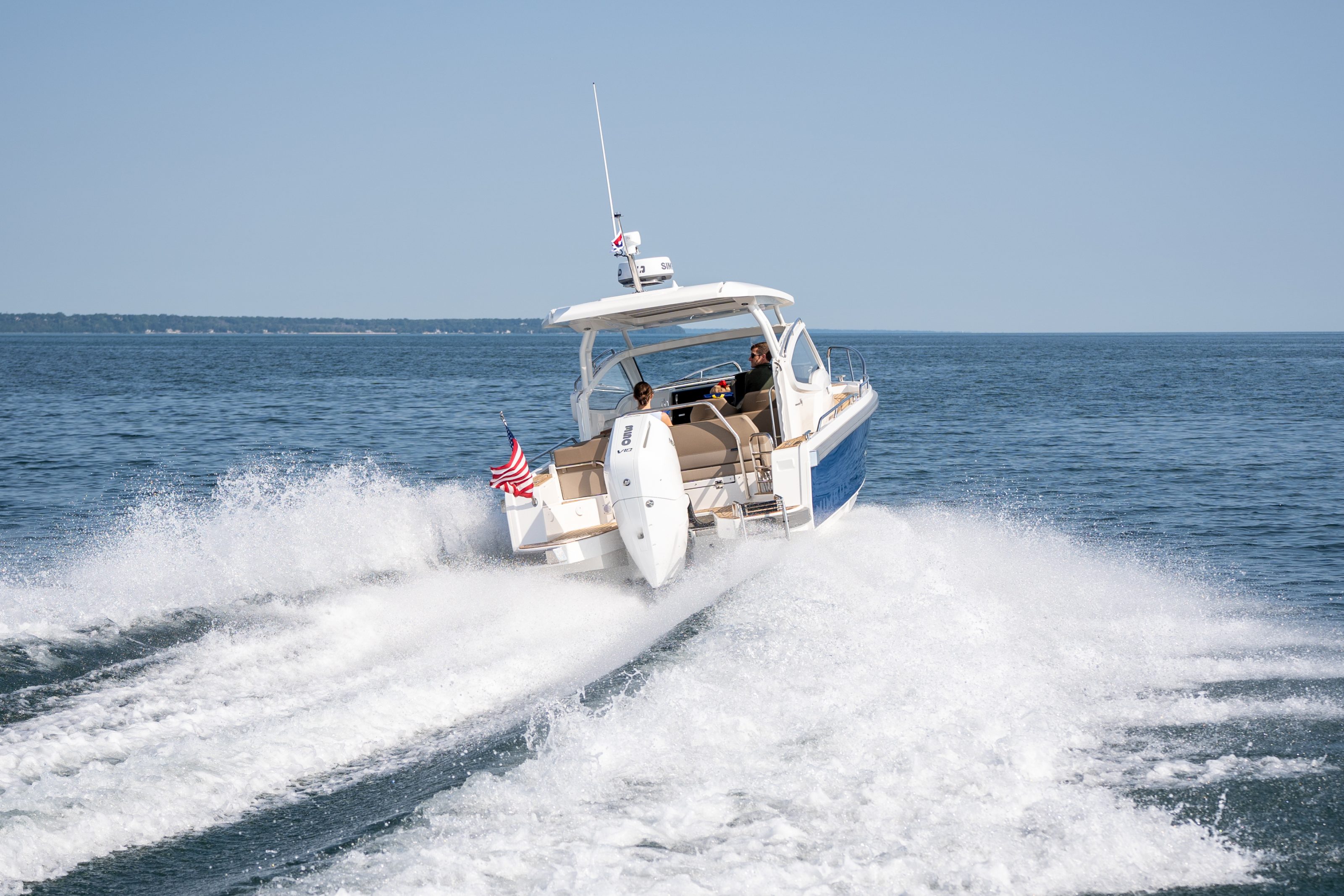 Among the design elements that will be easily recognized are the interior layout, which has many similarities to the 26 Epoca and 32 Ballista, the broad fore deck for extra safety and ease of boarding and disembarking, a feature of the Max II, the design of the side windows from the 22 Spectra, the design and function of the window frame with integrated canvas hood cover from the 305 Drophead, the air-lubricated stepped hull introduced to the Nimbus family with the R-series in 2000, and much more.